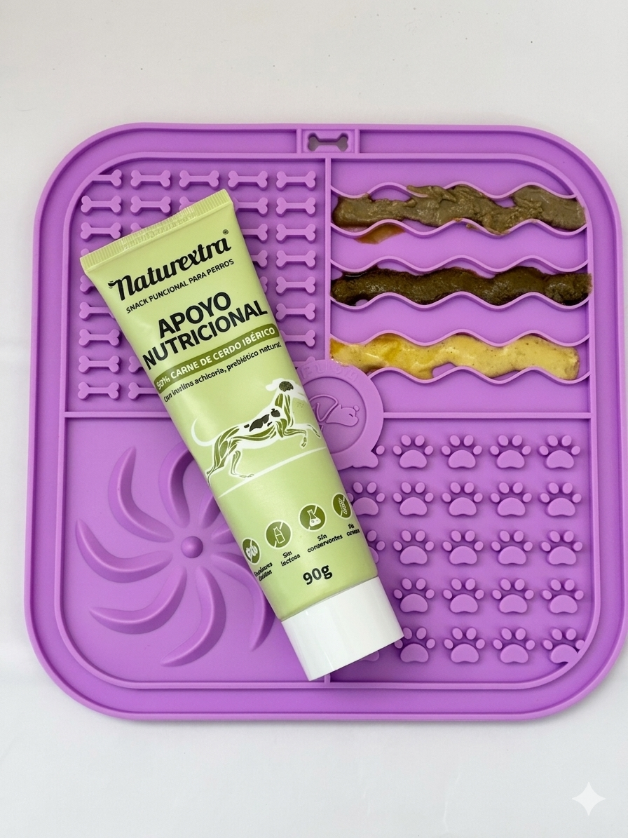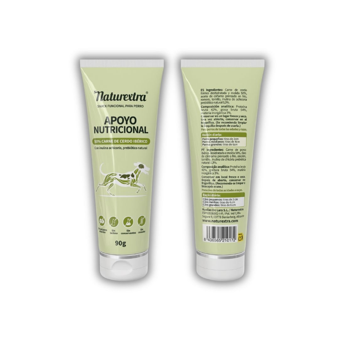 Snack funcional en formato pasta que permite una dosificación personalizada. Diseñado para aportar un extra nutricional en el día a día y facilitar la administración de alimento en perros exigentes o con necesidades específicas. Especialmente útil en dietas BARF o pellets, enriquecimiento ambiental y como apoyo en la administración de medicamentos.