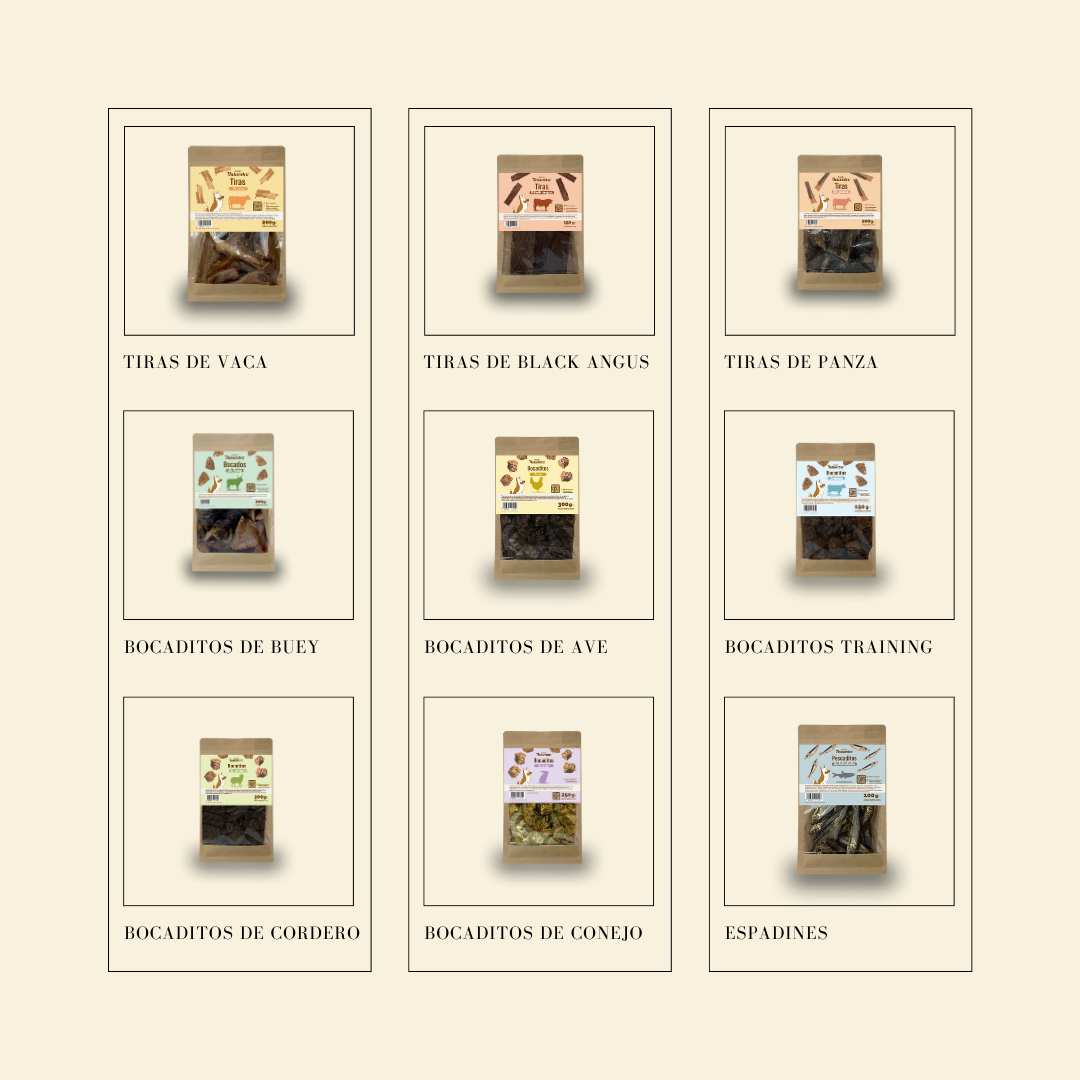 250 g y 500 g. Perfectas como premio, lickmat, complemento o mezcla con su comida.